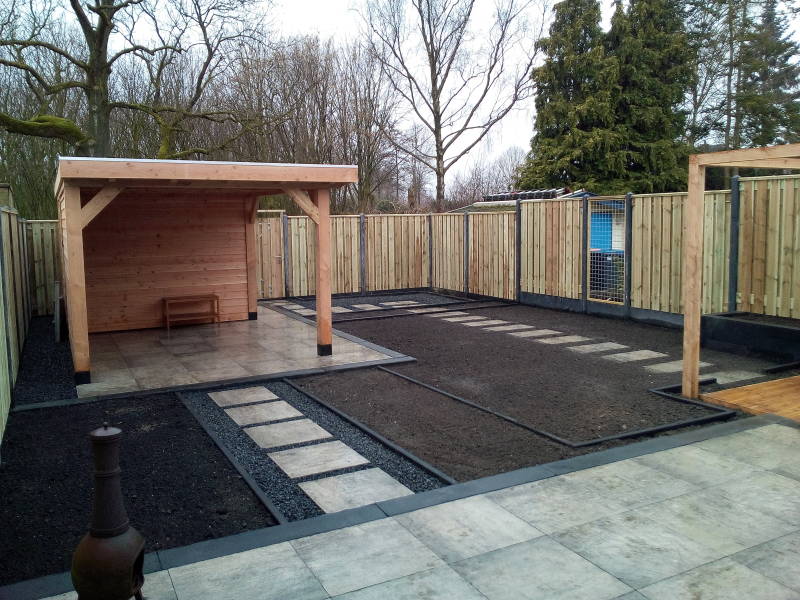 De tuin op bovenstaande foto is door Den Boer Tuinen ontworpen en aangelegd. Op de foto is de tuin in de afrondende fase en moet alleen de beplanting en het gras nog worden aangebracht.